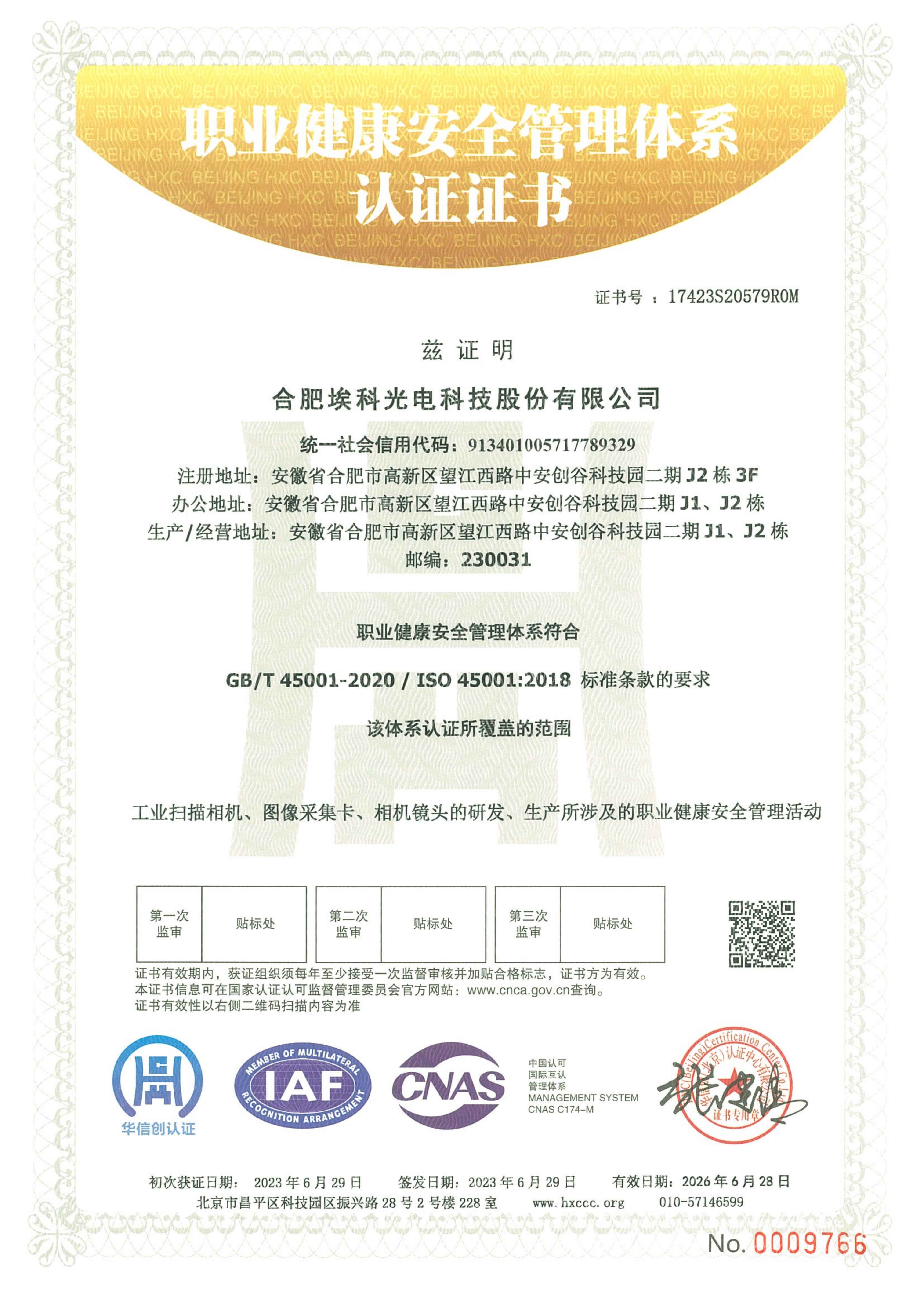 ISO45001职业健康安全管理体系认证证书