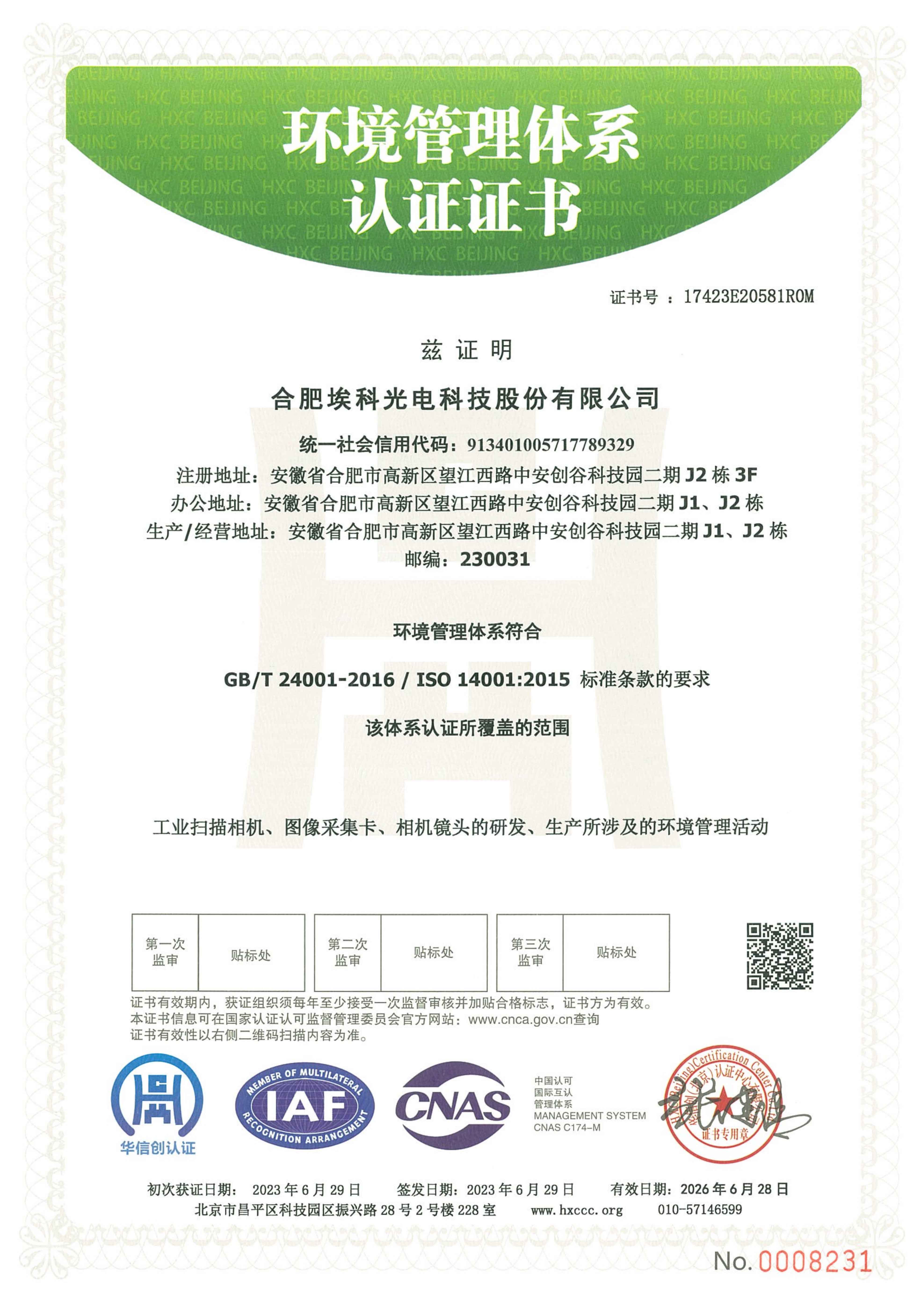 ISO14001环境管理体系认证证书