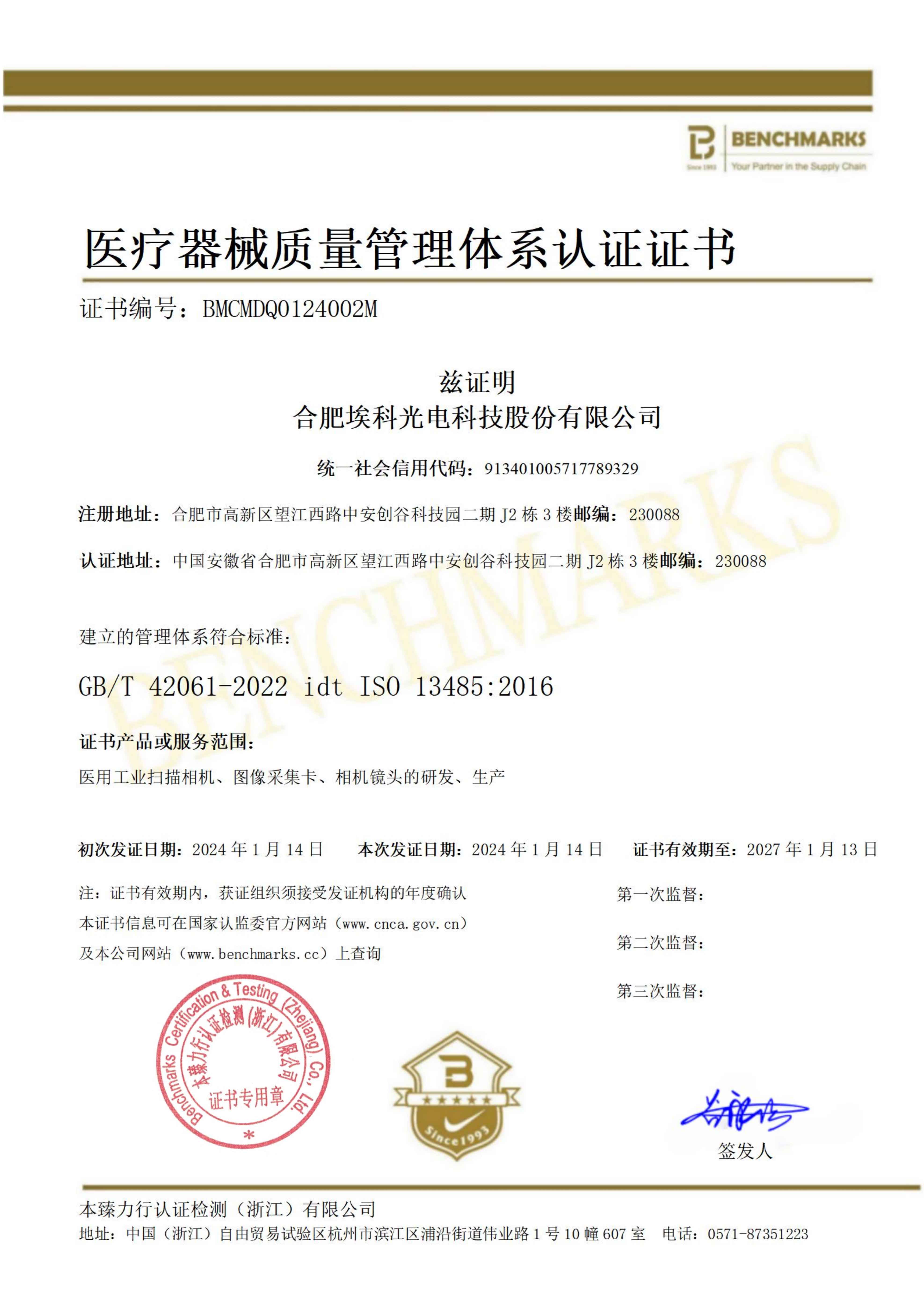 医疗器械质量管理体系认证证书